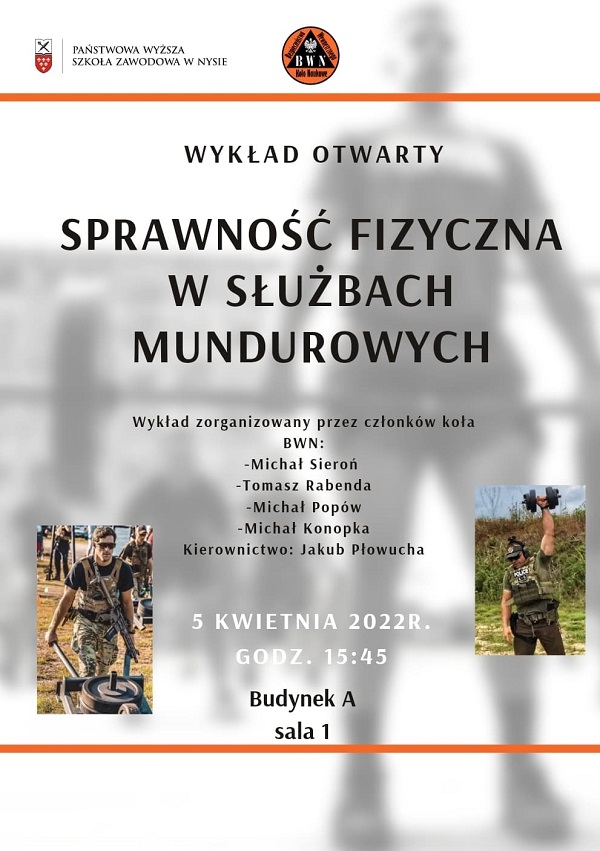 5 kwietnia 2022 roku o godzinie 15:45 w sali nr 1 budynku A naszej Uczelni odbędzie się wykład otwarty na temat: „Sprawność fizyczna w służbach mundurowych”. Wykład jest organizowany przez koło naukowe BWN, działające na Wydziale Nauk Społecznych. Wykład został przygotowany w ramach grupy naukowej koła w składzie: Jakub Płowucha (kierownik grupy) oraz członkowie: Michał Sieroń, Tomasz Rabenda, Michał Popów i Michał Konopka. Po wykładzie odbędzie się debata naukowa na powyższy temat.