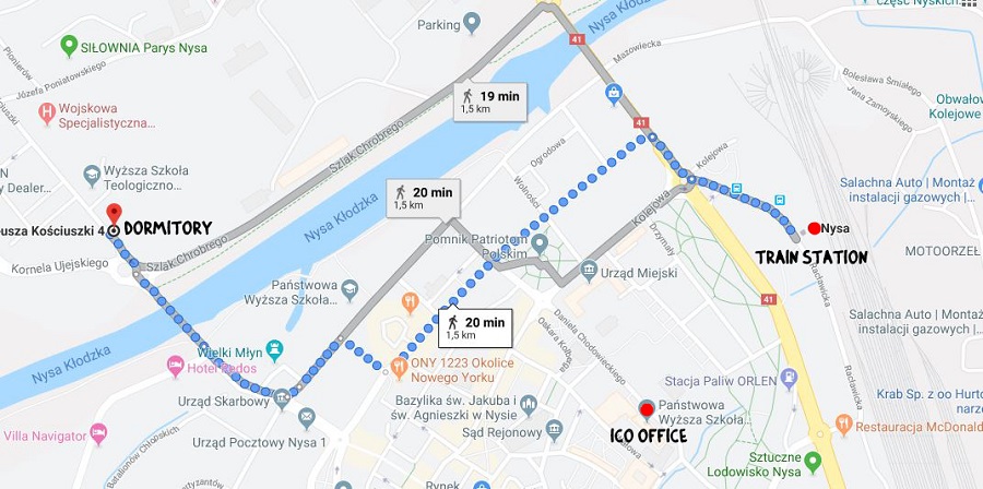 Train and bus station are in the same area. The way to dormitory goes through Kolejowa Street, Wroclawska street, Rynek (market square), Mostowa street and it ends on Kosciuszki street. Dormitory in Polish is "Akademik" or "Dom Studenta" in case of asking citizens for the way. You can also use the Google Street View or a dedicated site www.dormitory.osc.pl before arriving, to see how the way looks like.